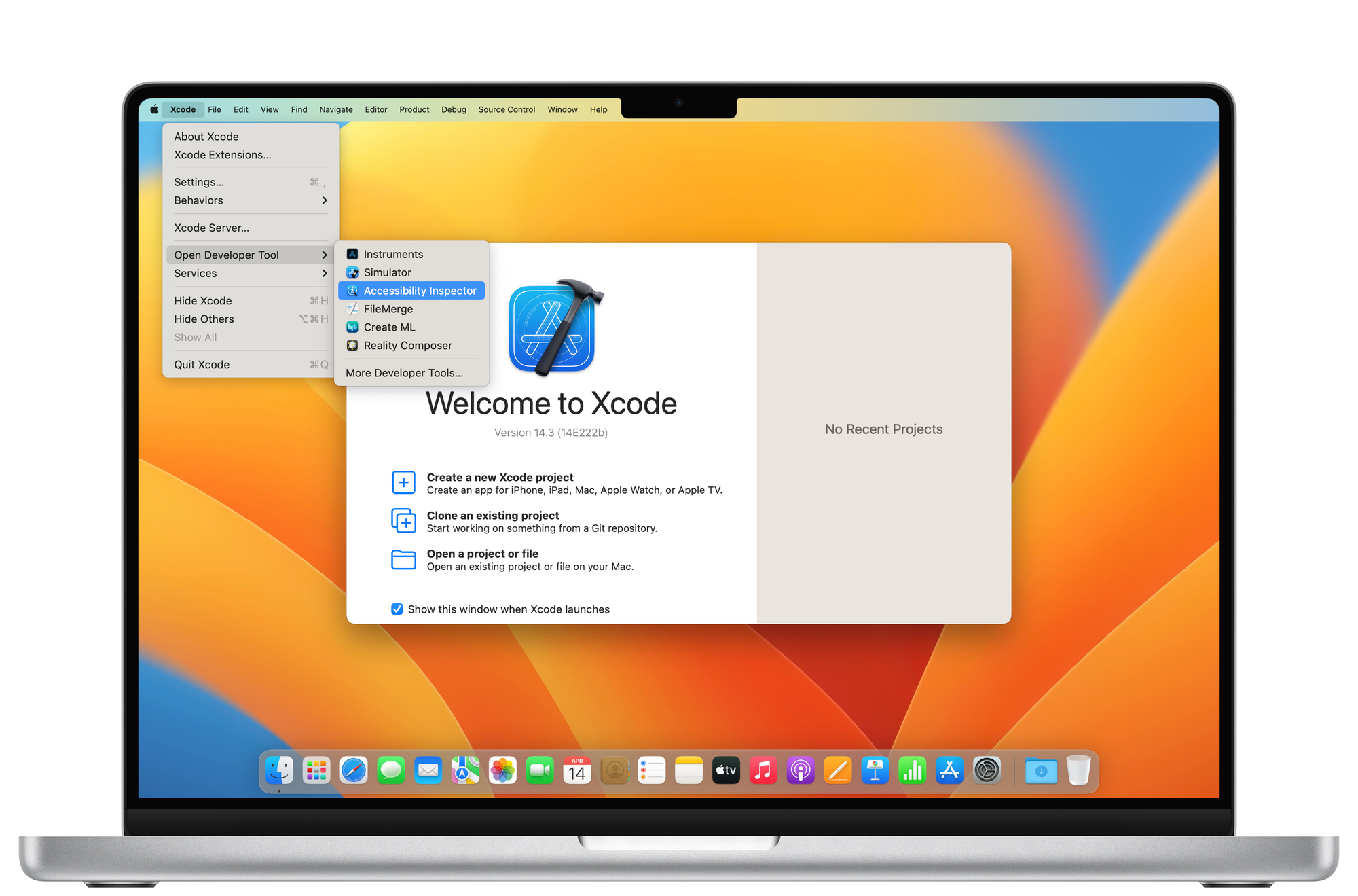To launch the Accessibility Inspector app, in the menu bar go to Xcode > Open Developer Tool > Accessibility Inspector.