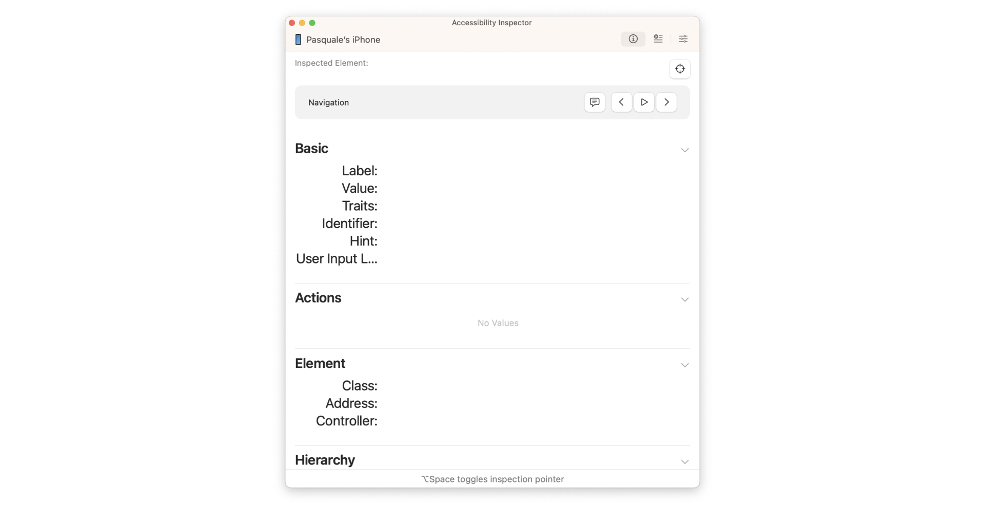 In the navigation section, you can let the Accessibility Inspector mimic VoiceOver by reading the description of the selected element, navigate to the previous or next accessible element or navigate automatically through the entire app to simulate the real VoiceOver experience.
