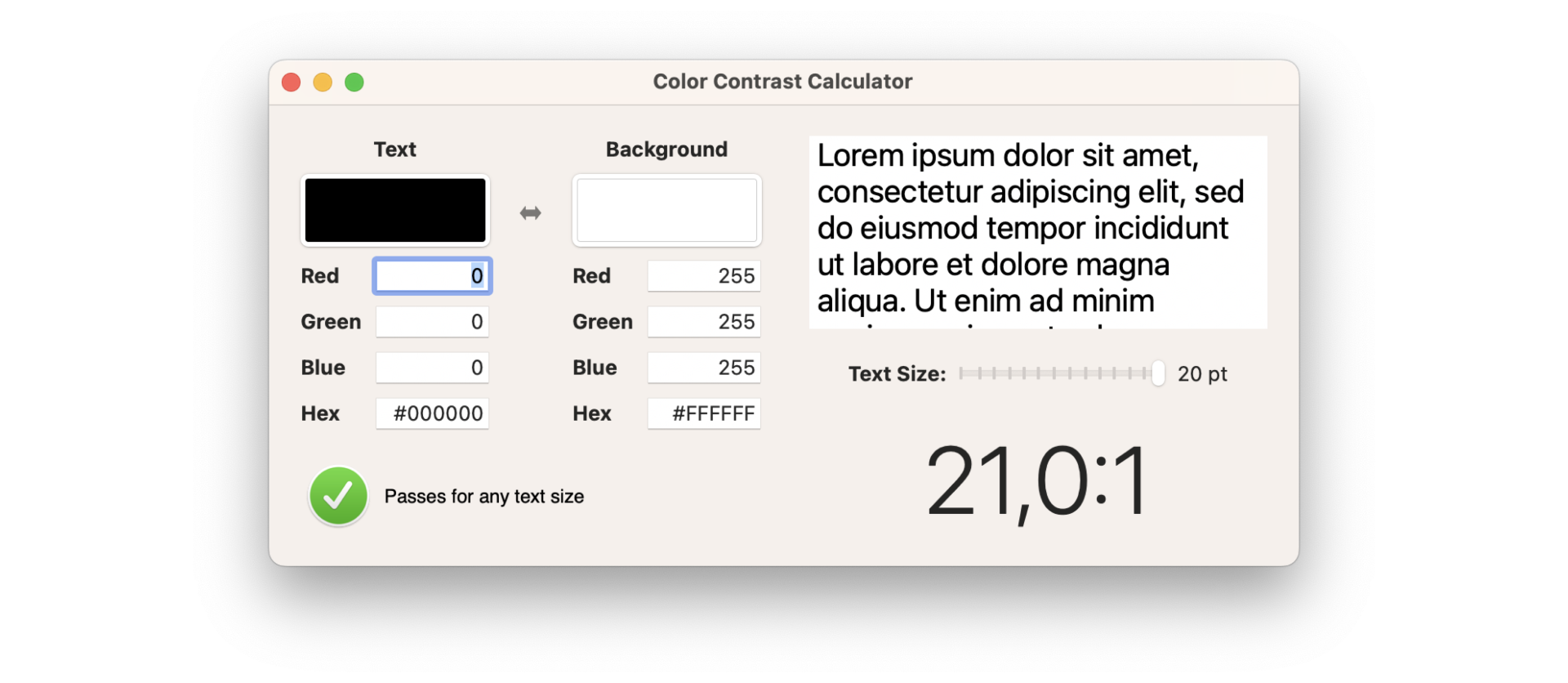 We have seen that the Accessibility Inspector app also gives you warnings and feedback regarding these aspects but it also provides a Color Contrast Calculator tool you can use to check the contrast between the foreground and background colors and check it for every text size.