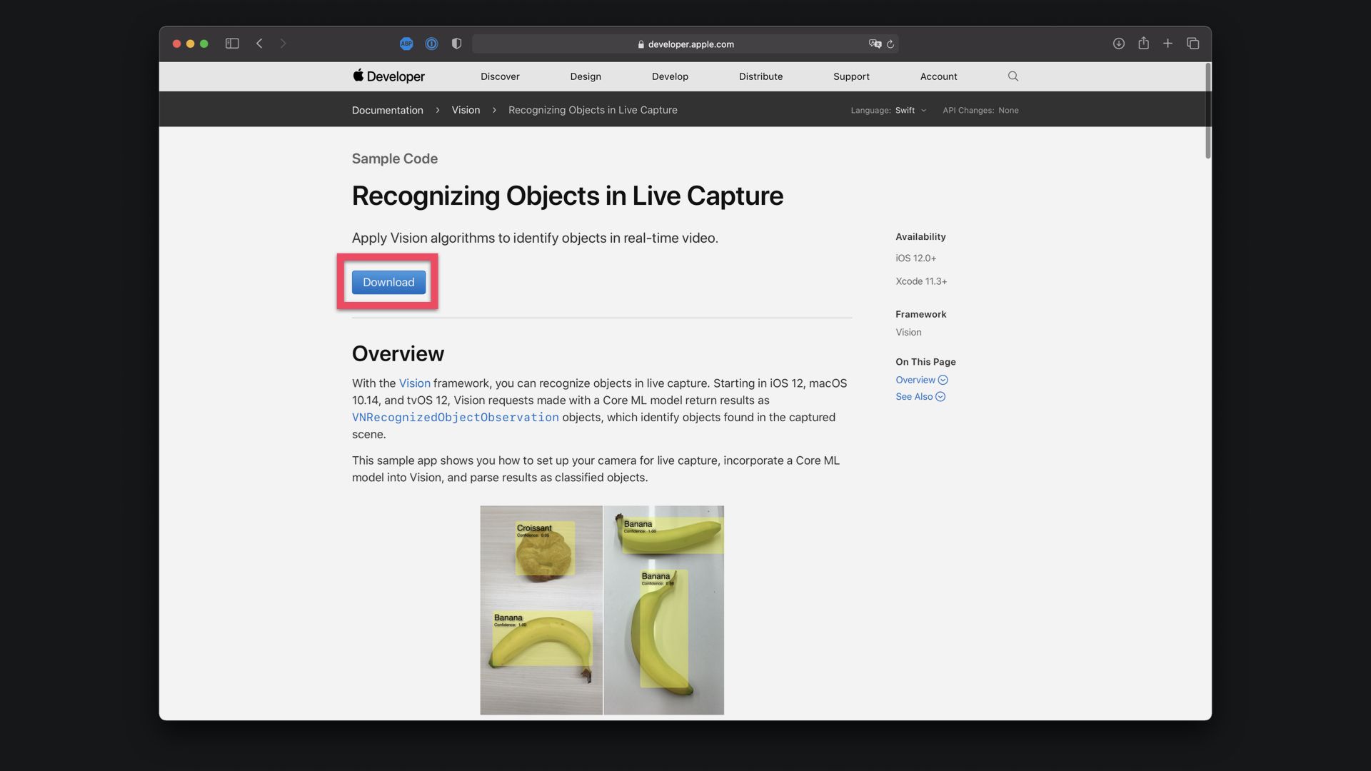 For using Core ML models with the Vision framework in an iOS app, Apple provides a number of sample projects in the official developer documentation. For this short example, I am using a boilerplate Xcode project that Apple provides on their Website to recognize objects in live capture, so in live video feed. There are other sample code projects to detect objects in still images, classifying images for categorization and search or tracking multiple objects in video.