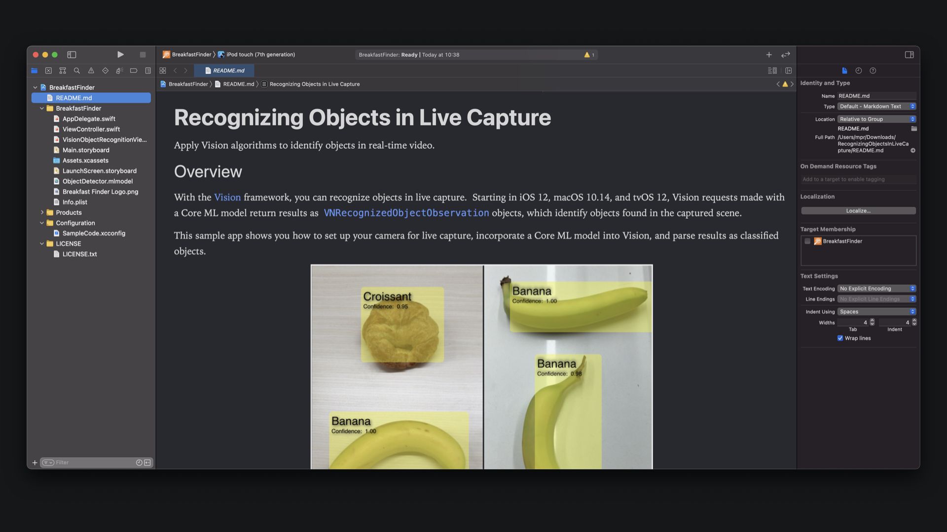Once downloaded you can open the Xcode project, compile and run the app and will immediately work with the pre-installed ObjectDetector model that is trained to identify 6 breakfast foods.