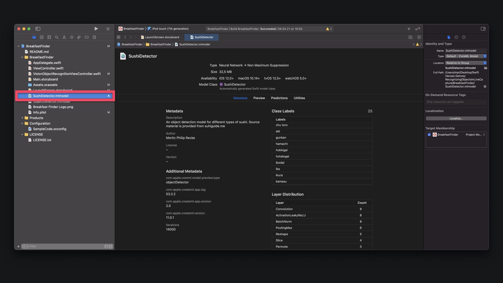I am using a SushiDetector model in this example, a custom object detection model created to detect different types of sushi. If you want to know more about creating your own custom object detection machine learning model with Create ML, check out our step by step tutorial.