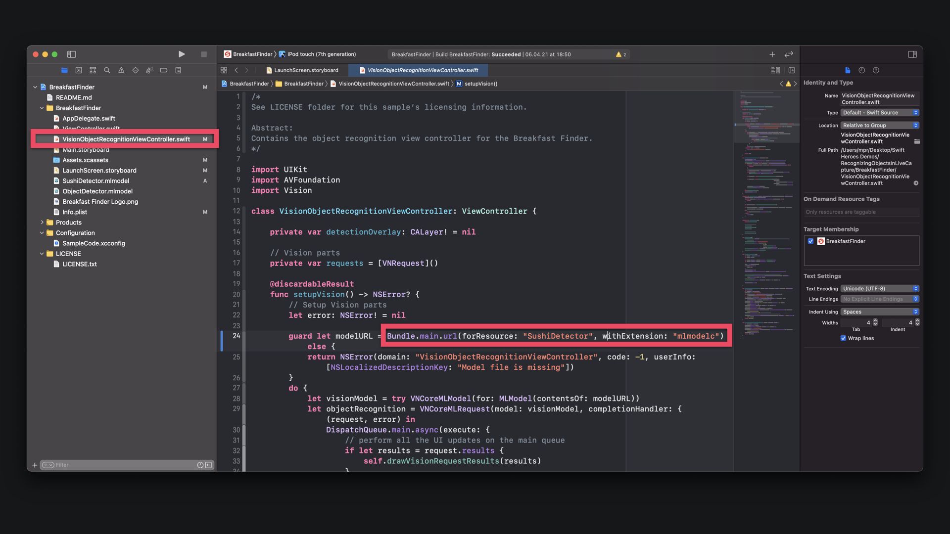 In the VisionObjectRecognitionViewController.swift file you just have to specify the model name within the setupVision() function, everything else done for you.