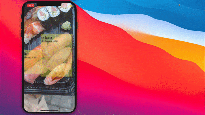 }To test the app, connect your iPhone and install the app on the device. As you can see, in my example, it correctly detects some sushi dishes as I hold the camera close to my lunch bento box.