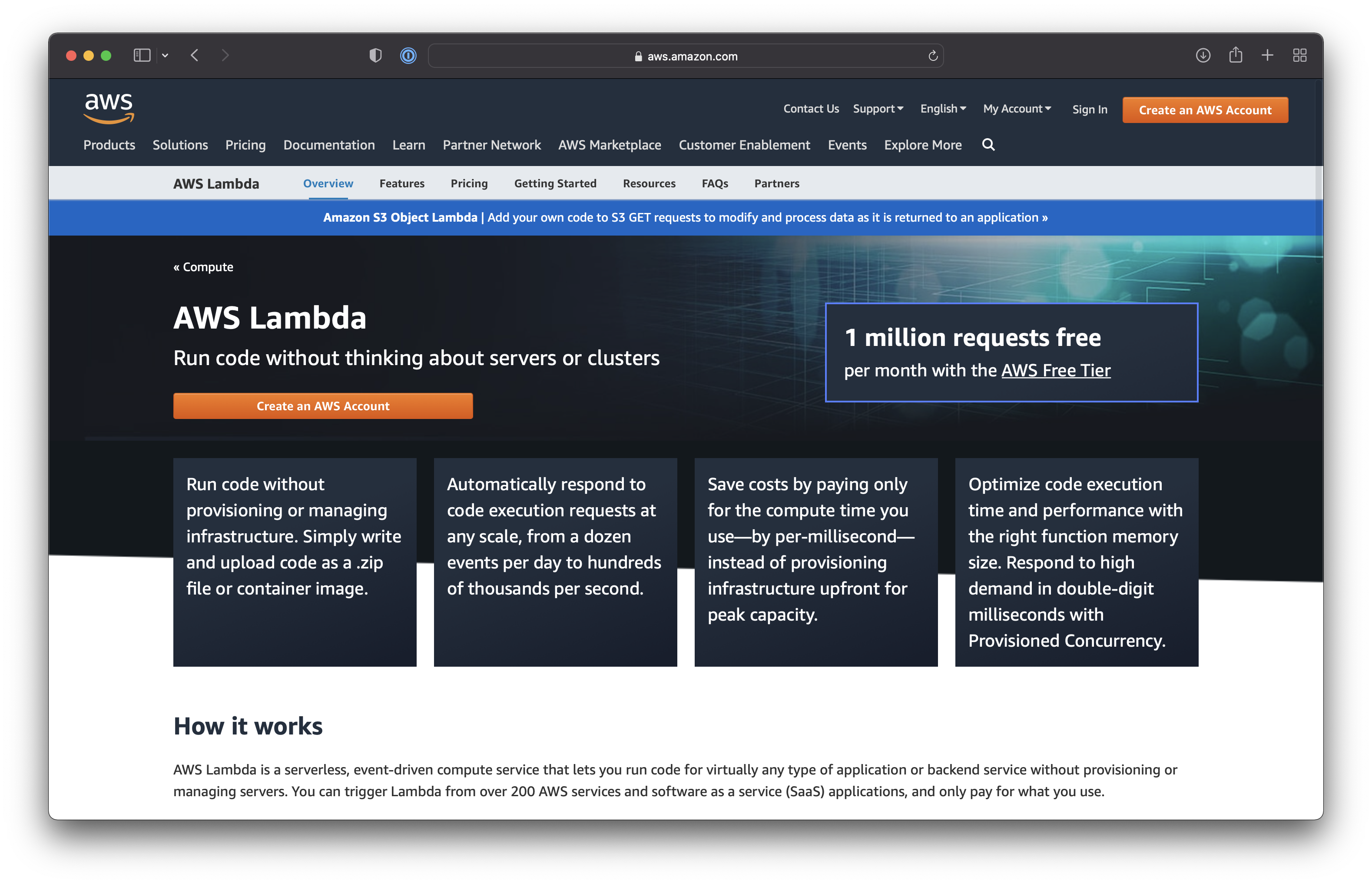 It was introduced in 2014 and supports Node.js, Python, Java, Go, Ruby, C# and, as of 2020, also Swift as part of their custom runtime support. Typical use cases are uploading data to Amazon S3 buckets, updating DynamoDB tables, reacting to sensor data in IoT environments, etc. All of these can be conveniently set up through HTTP requests configured in AWS API Gateway, which can also handle authentication and authorization. This means, apart from writing some simple Lambda functions, the entire configuration of even fairly advanced AWS backends can be set up in the web browser just by provisioning services like S3, DynamoDB, CloudFront, or API Gateway.