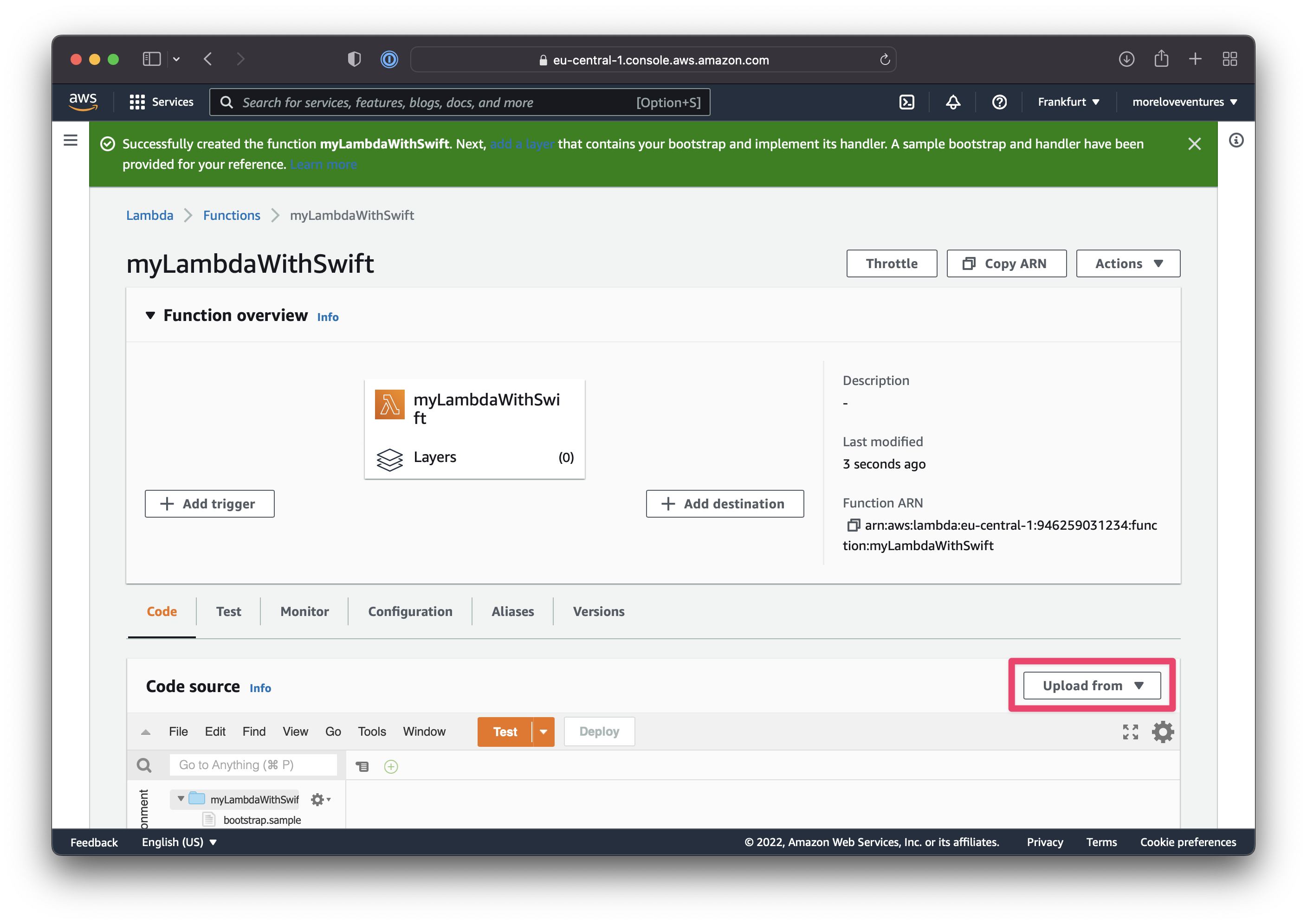 You will be redirected to the newly created Lambda function and can select "upload from" to either upload a zip file or select a file from S3 storage. Upload the zip file created before and AWS will do the rest.