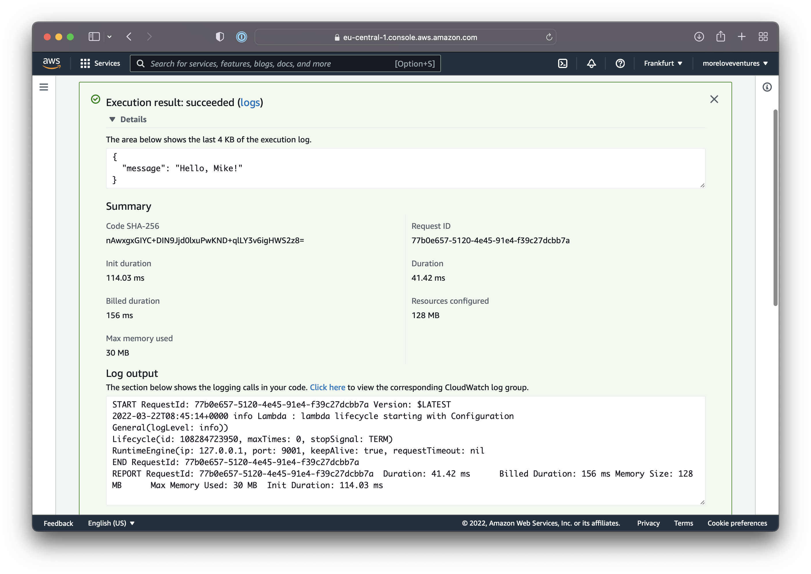 Once the test has been saved, you can execute the test to verify if the Lambda works as advertised. The console provides nice Execution results where you can see the execution log and whether the test succeeded.