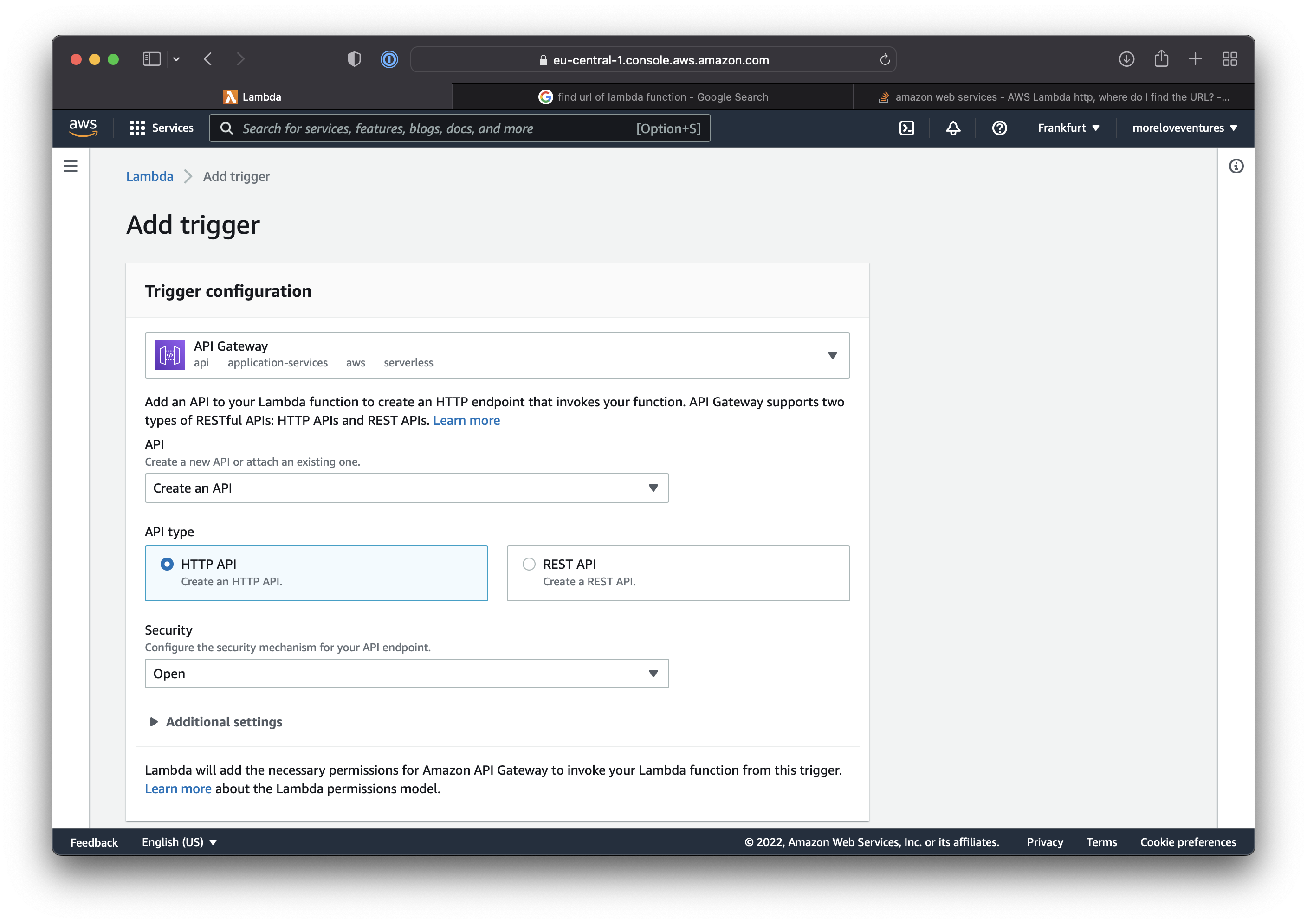 In the following setup assistant you can select API Gateway as a trigger then either select and existing or create a new API service. You can choose between HTTP and REST API and configure the security options for acces. If you select "open", anyone with the URL can access the Lambda function.