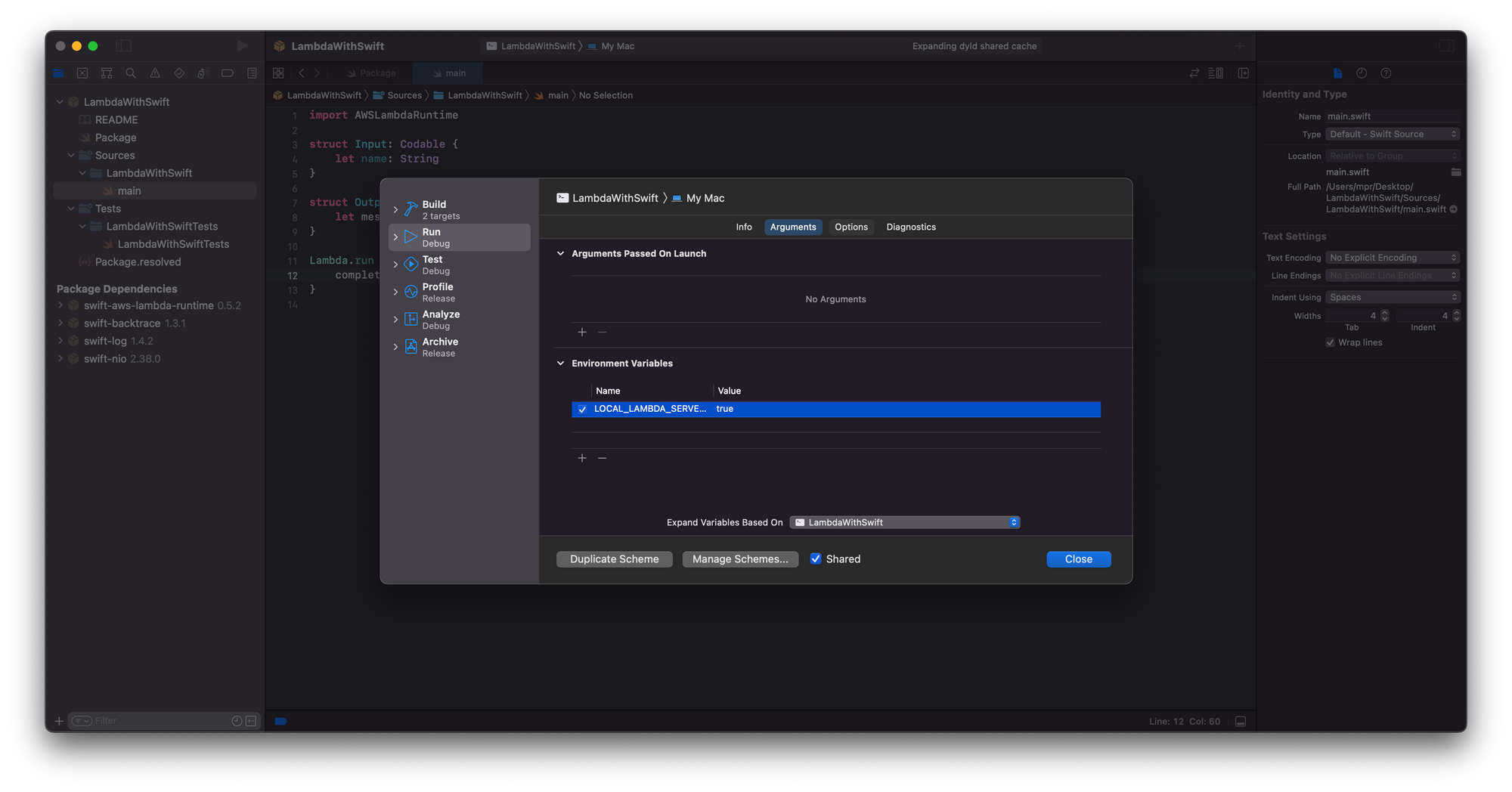 Before preparing your Lambda function for deployment on AWS, it can also be tested locally. Luckily, the Swift AWS Lambda Runtime makes this very convenient. The only thing needed is to add an Environment Variable to the Xcode project.