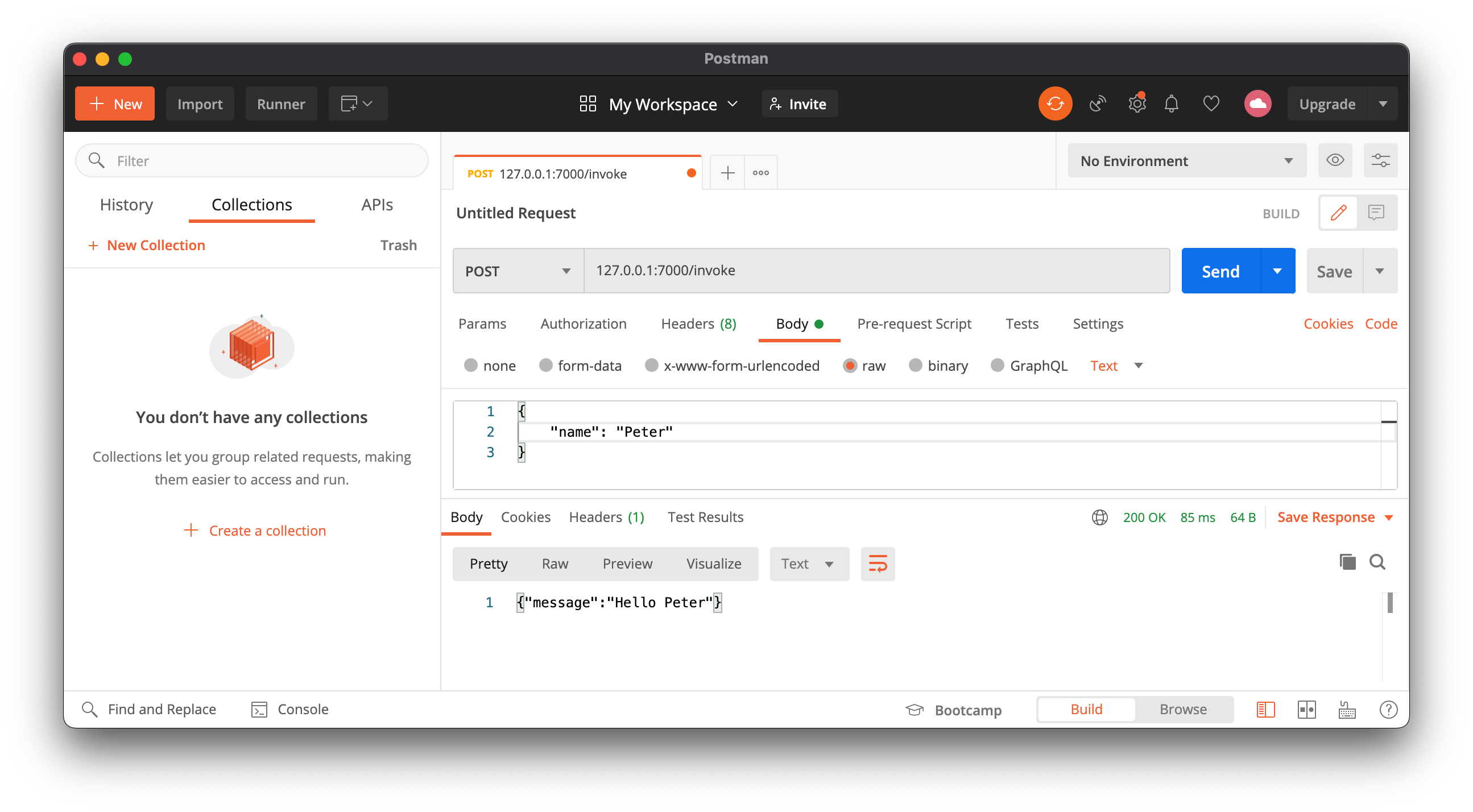 You can use curl from the command line of course, or install Postman for more convenient local testing. By creating a new POST request to 127.0.0.1:7000/invoke and configuring the body of the HTTP request with the JSON object expected as an Input, you will receive a response from the Lambda function configured as the Output in the Lambda.run closure.