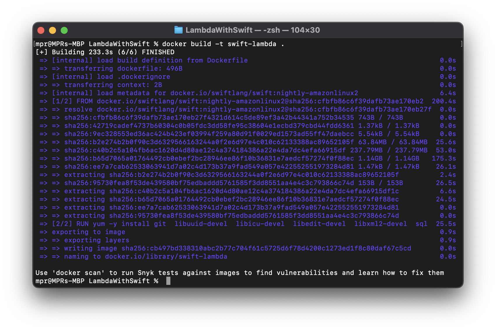 zip --symlinks lambda.zip *The script is provided as part of the examples in the swift-aws-lambda-runtime project on GitHub. Then, from the command line, you can run the docker command again, but this time executing the script.