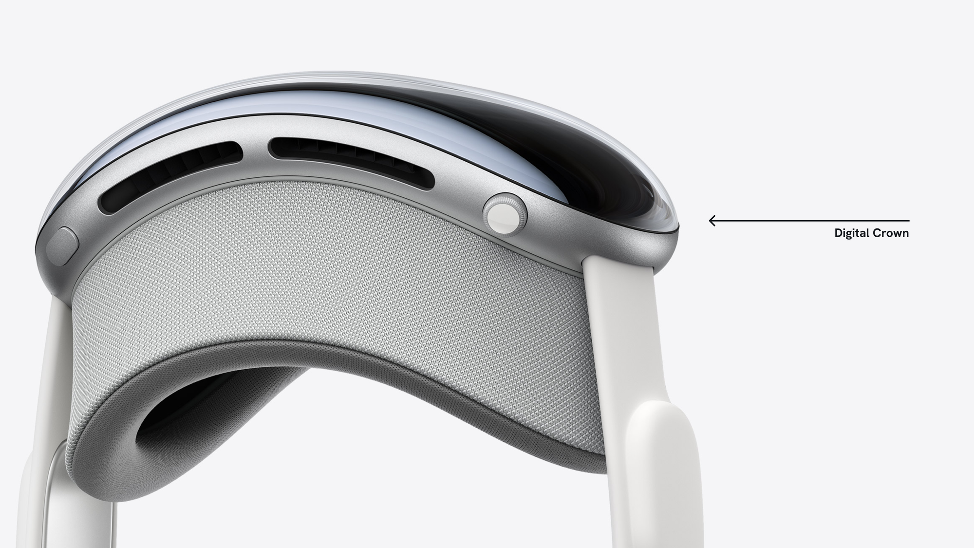The Digital Crown serves as a control to fine-tune the amount of passthrough, allowing users to find the ideal balance between the virtual and physical environment. Users can increase passthrough to reveal the physical surroundings, facilitating interactions with nearby objects, or decrease it to bring up immersive experiences such as an Environment.