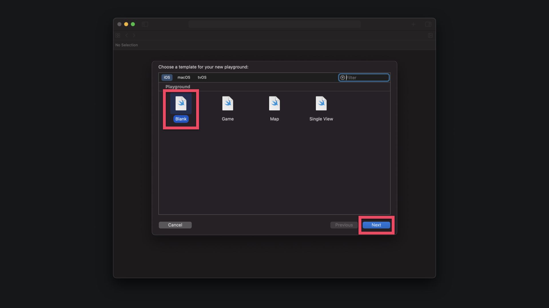 Choose "Blank" and then click "Next" on bottom right. In the following step, choose a file name to save the Playground and click "Create". Xcode will create the Playground files and open the editor.