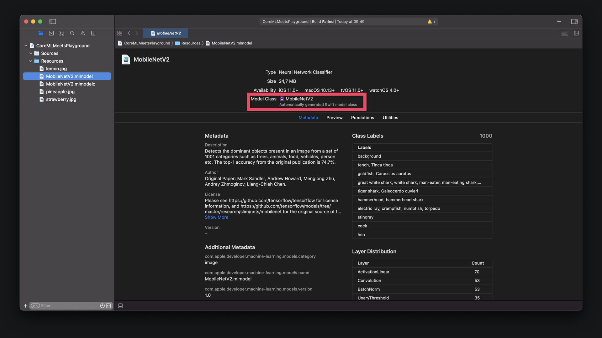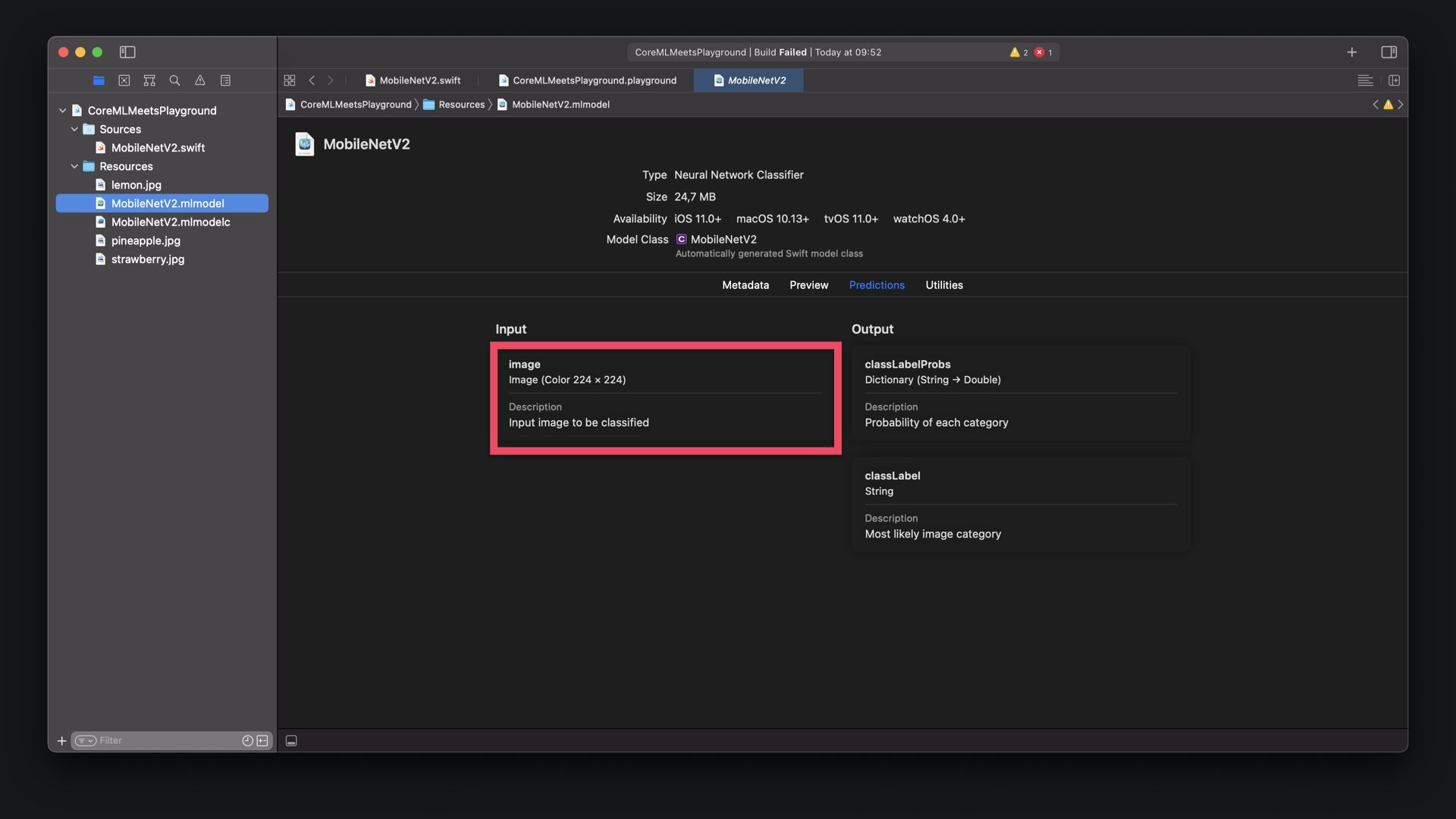 Also the Core ML .mlmodel file can be added to the Playground's Resources folder. Once added, the Model Class named MobileNetV2 can be opened by double clicking on the symbol in the Metadata tab of the model. It will be opened in a new tab in the Playground.