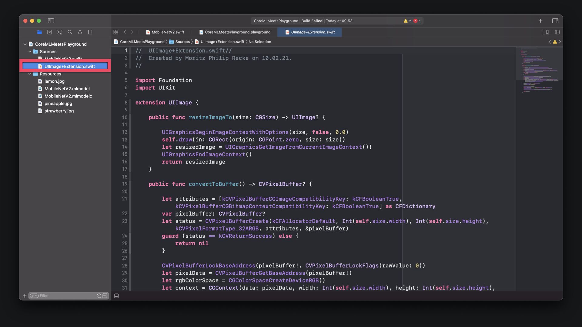 As a consequence, this means that we have to resize any image to that dimensions to be accepted. Also, the input type is not an UIImage but either a Core Image Image (CIIMage), Core Graphics Image (CGImage) or a Core Video Pixel Buffer (CVPixelBuffer). To create the CVPixelBuffer, the image has to be converted, which is not a trivial task. The easiest way to achieve these goals is adding some extensions to UIImage.