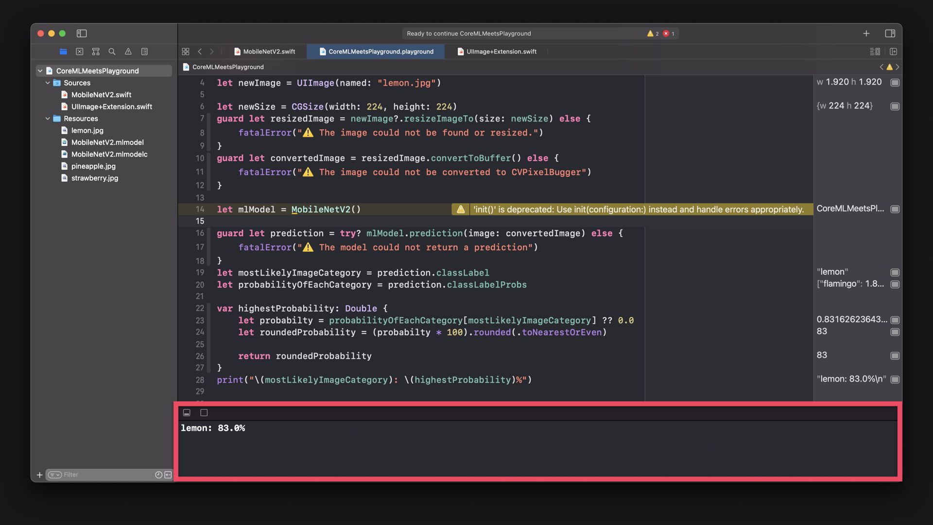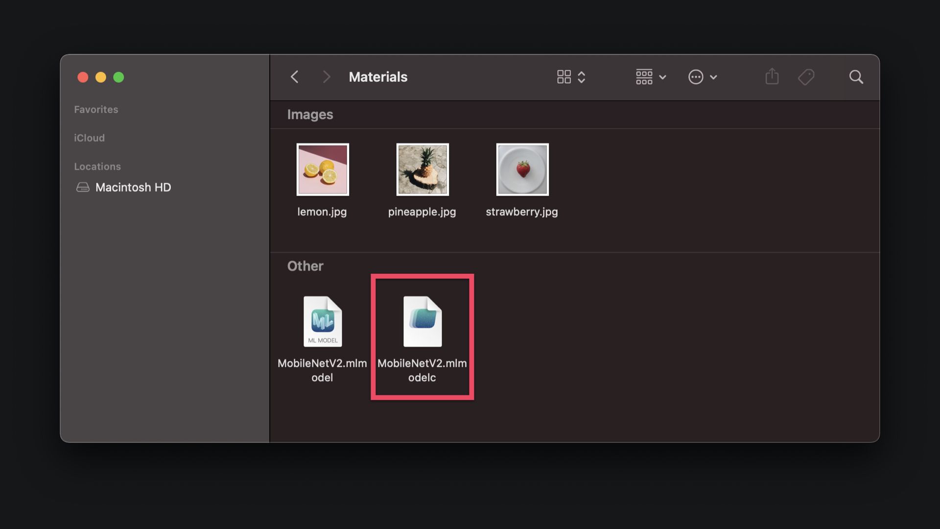 For you convenience, the .mlmodelc file can also be downloaded here alongside some sample images that can later be used to test the model in Playground. Add the images to the Playground's Resources folder by dragging and dropping them in it.