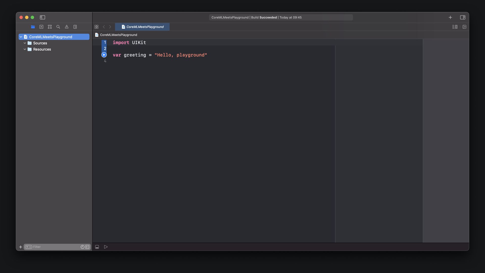 The Playground opens with a simple "Hello, playground" String in the main editor. If not open already, click on the Navigator icon to show the sidebar. The Playground has a Sources and a Resources folder in which additional files can be stored. The sources folder may contain other source code files, while the resources folder may contain any types of files, such as images, text files or in our case the machine learning model.