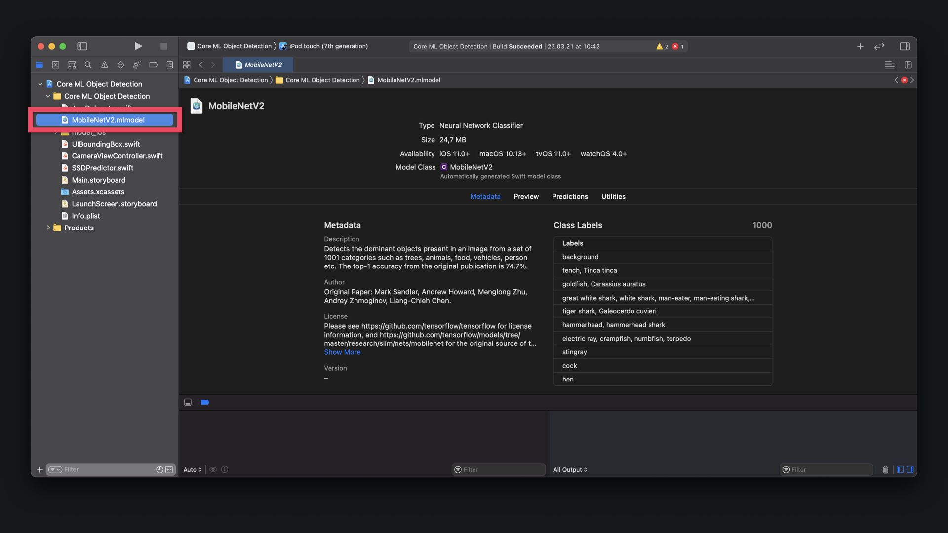 In the .mlmodel file, you can also check the output parameters for the Core ML model. In this case, the MobileNetV2 model will deliver two outputs: