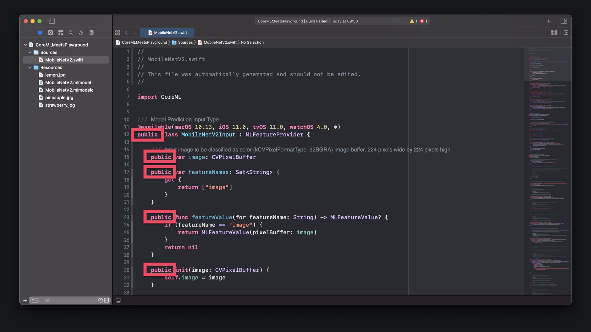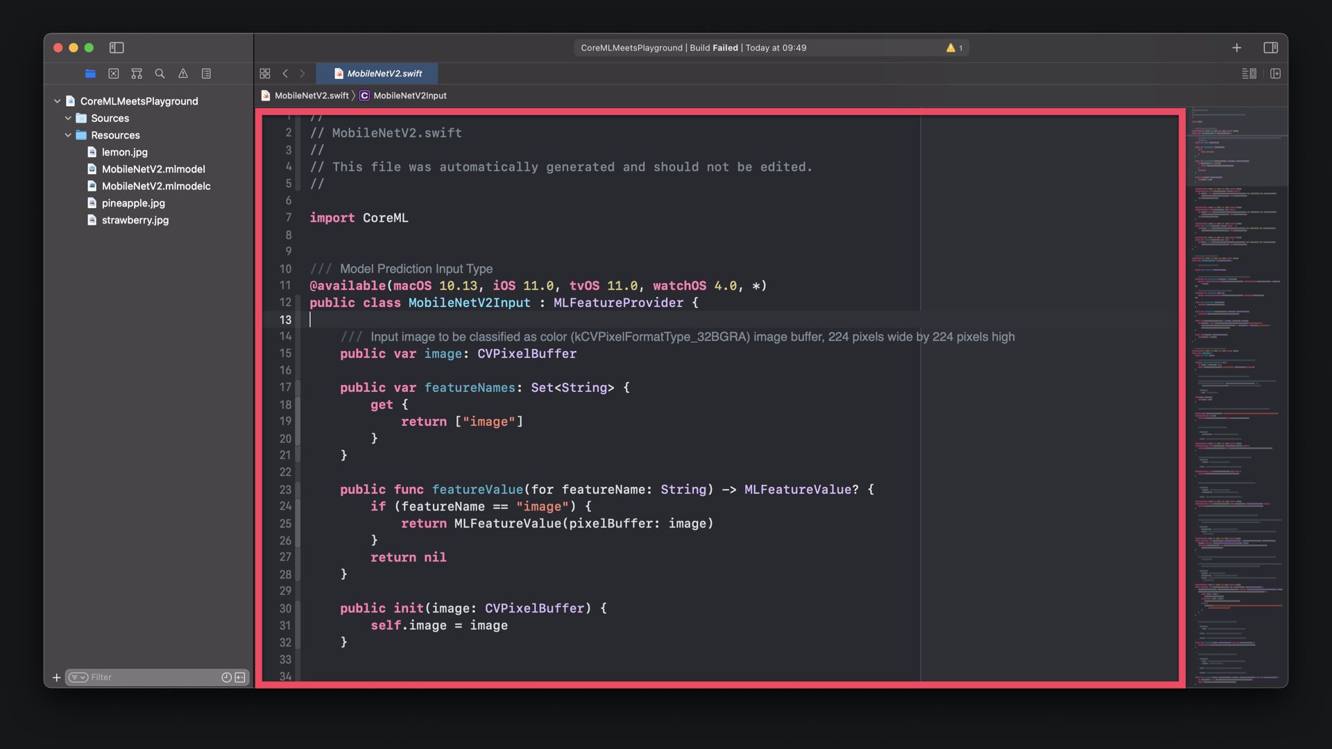 The MobileNetV2.swift contains all the necessary code to use the Core ML model. For the purpose of the this tutorial it is not critical to understand the entire code of the class. To use the Core ML model in Playground, copy the entire code and then close the file.