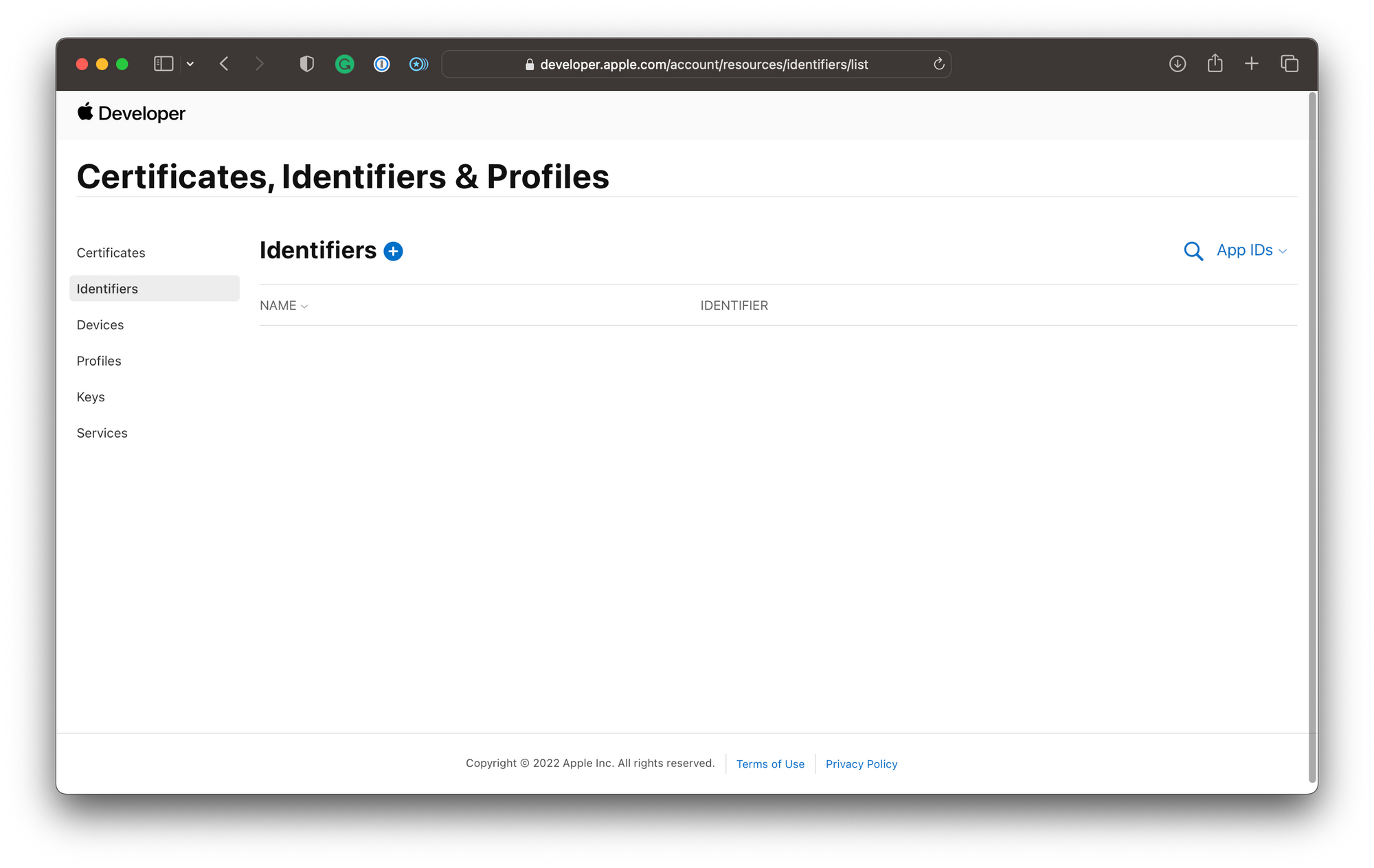 First, you have to create a Maps Identifier in your Apple Developer Account. It is a string that is used to identify a domain or environment that is calling the MapKit JS API. Inside your profile at developer.apple.com/account navigate to the Certificates, Identifiers & Profiles section and select Identifiers in the sidebar.