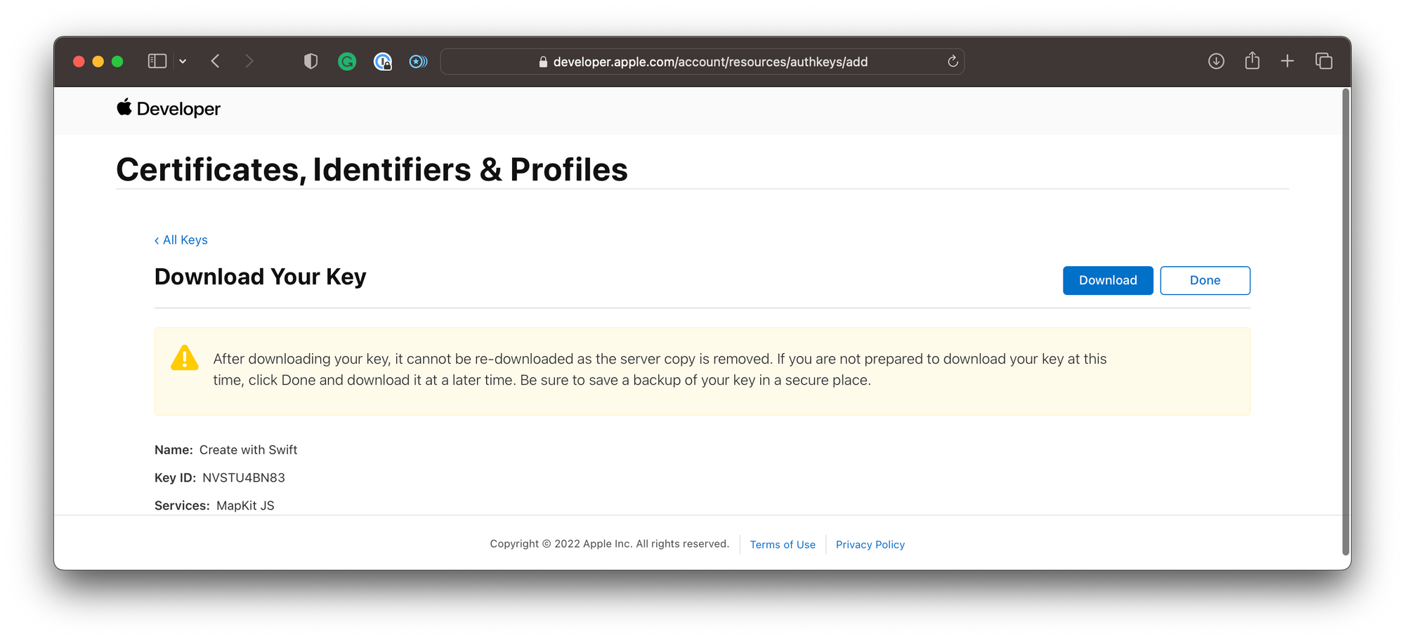 In the final step, you can download the private key. It is needed in the following steps to create a JWT to use MapKit JS in websites. Make sure to store the key in a safe place and not lose it. The private key is stored as a .p8 file.