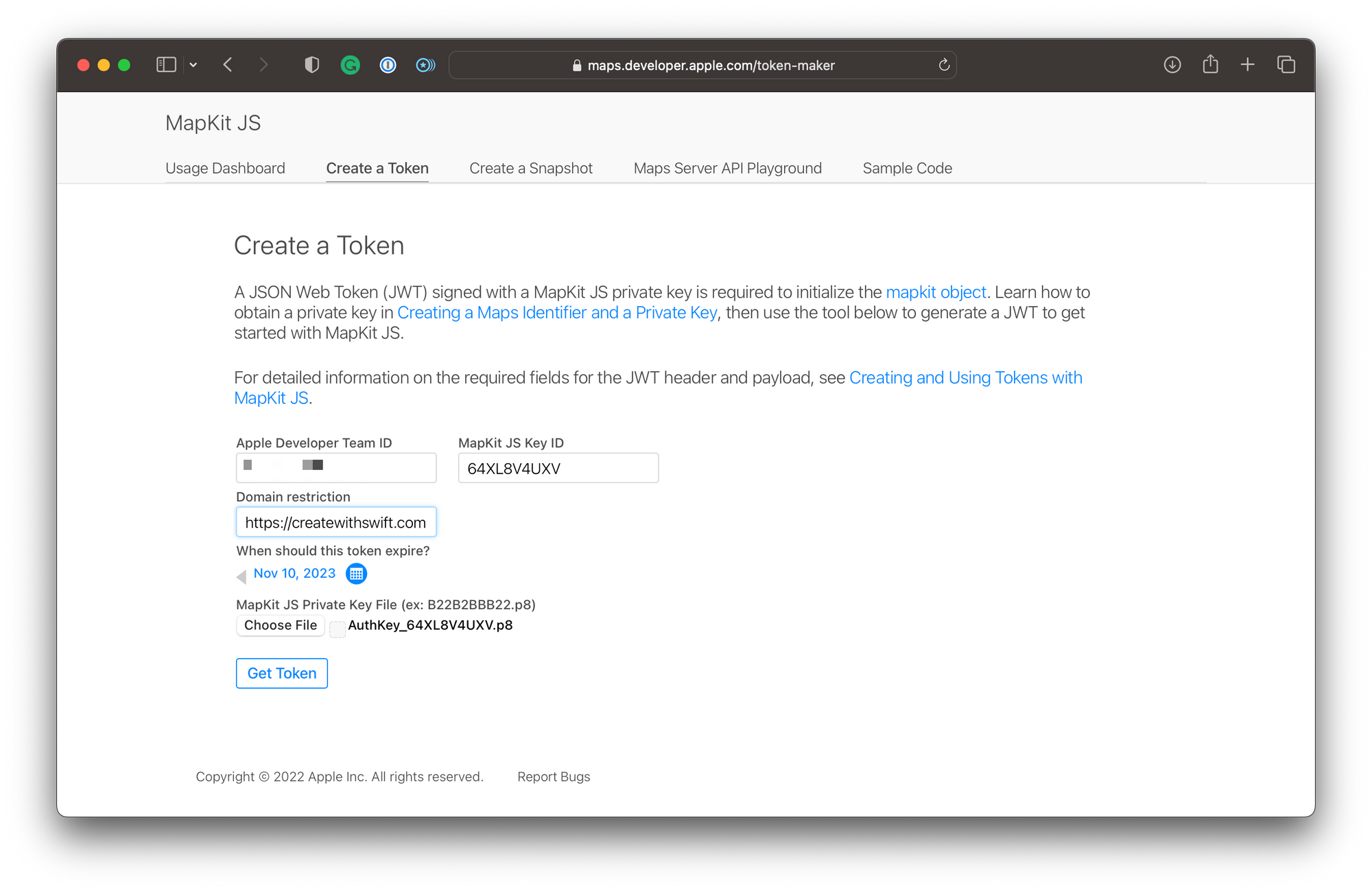 To generate the token, you have to provide the Apple Developer Team ID, which can be found in the membership details of your Apple Developer Account and the MapKit JS Key ID which can be found in the keys of the Certificates, Identifiers and Profiles section. Then you can restrict the token to a specific domain so that if it is used on any other domain, it would not work as well as an expiration date for the token. The maximum length for the validity of the token is one year. Lastly, you have to provide the MapKit JS Private Key file that you downloaded when you created the key.