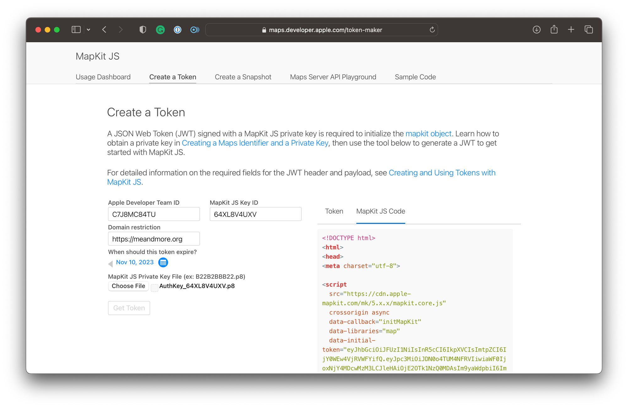 After clicking on Get Token, the website generates the token as well as a MapKit JS sample code with a simple implementation for you to get started with.