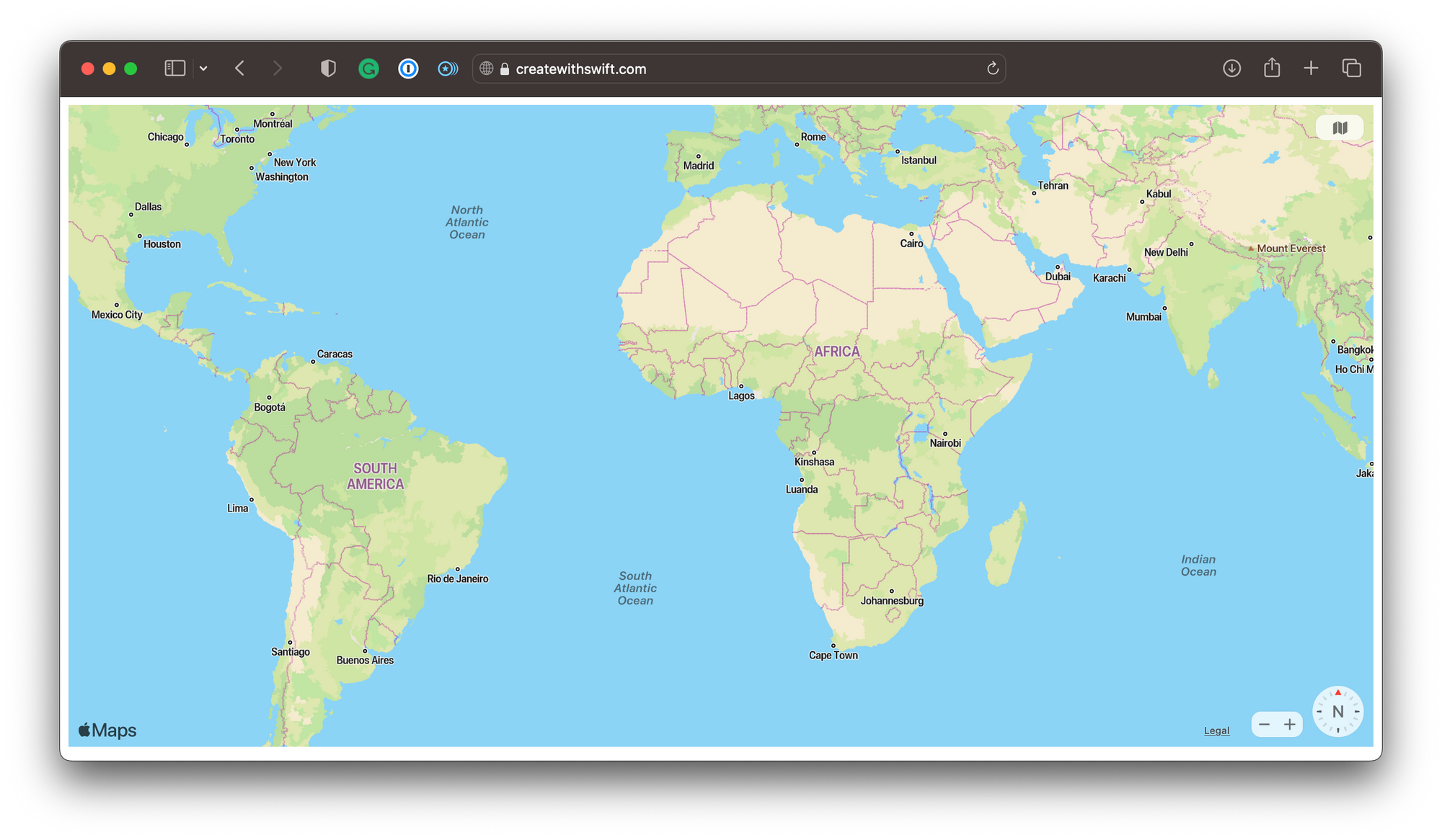 By adding the MapKit JS Code to your website HTML, you can now easily embed Apple Maps in your website. To get some ideas on how this could look, consider the Apple MapKit JS overview. In our case, we just hosted the default template HTML on createwithswift.com, which shows an interactive map of the entire world.