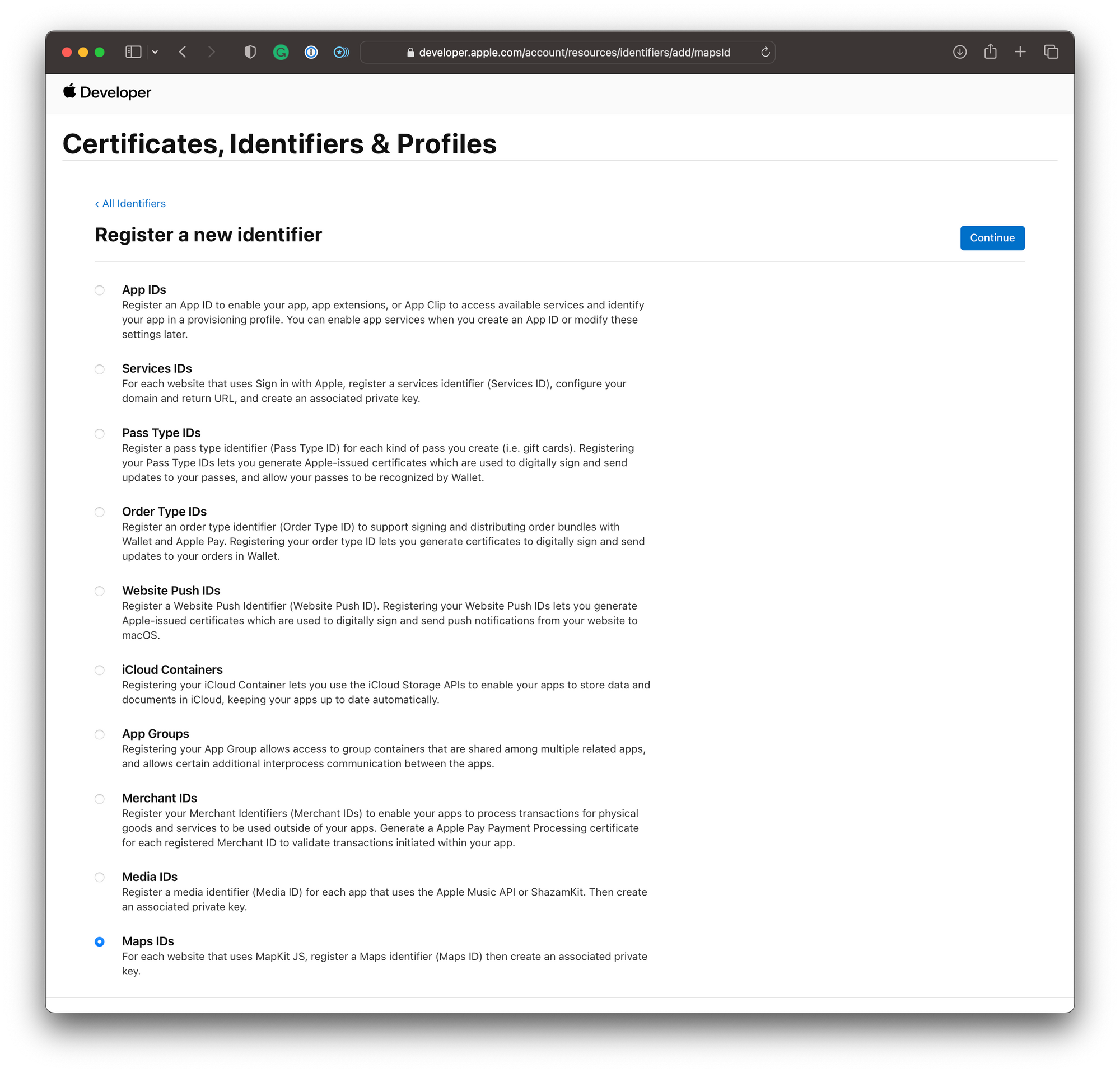 Inside the dialog to register a new identifier, select Maps IDs as the type of identifier and click continue.