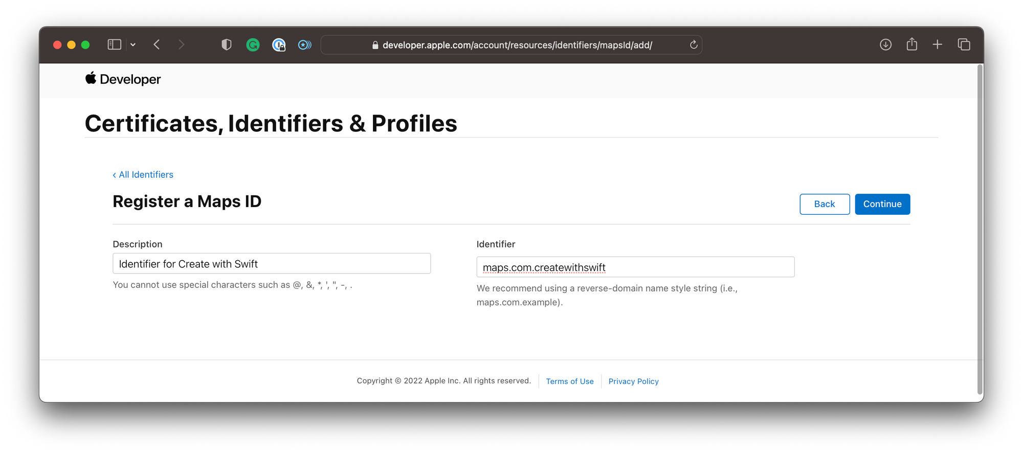 Then, you have to provide an identifier for which Apple suggests a reverse-domain-style string, for example, maps.com.createwithswift. Then, click continue.