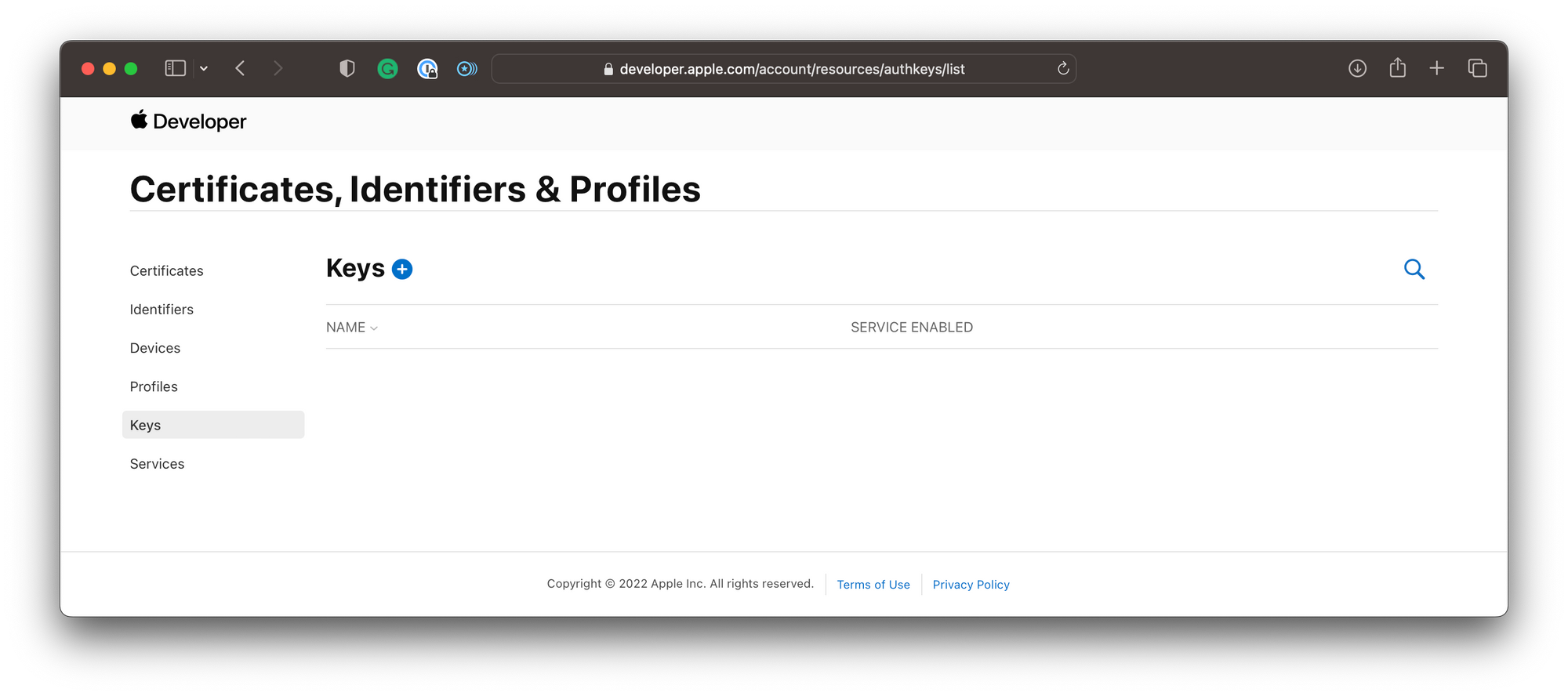 As a next step, you now have to create a new private key and link this key to the MapKit JS service and associate it with a Maps ID. Inside the Certificates, Identifiers & Profiles section, click on Keys in the sidebar, then click the + symbol to create a new key.