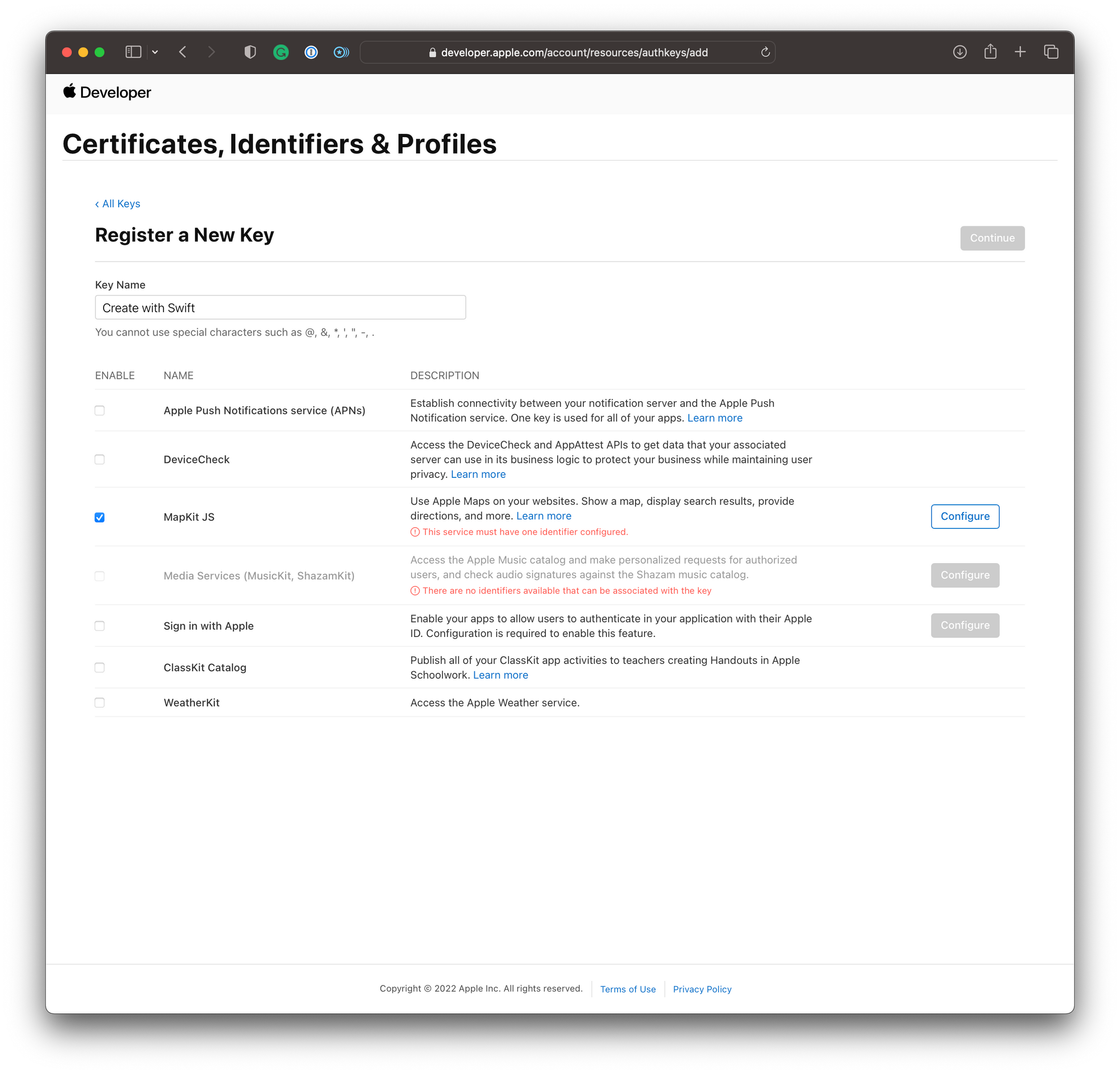 In the dialog to register a new key, select MapKit JS to create a key for usage with MapKit JS. To associate the just-created identifier with the private key, click on configure.