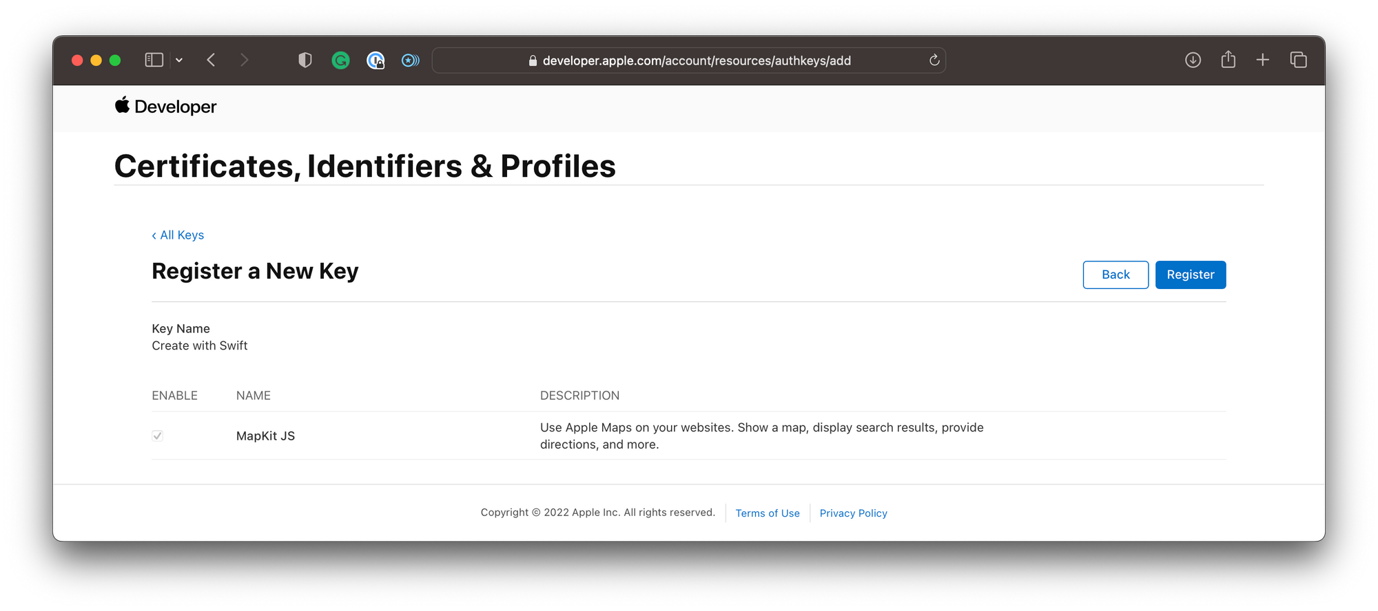 Creating a Maps identifier and a private key for MapKit JS