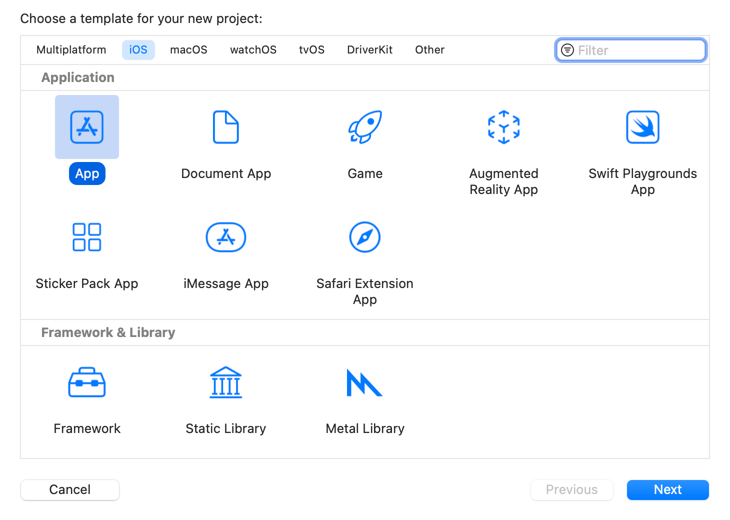 When creating a new project, select the App template and create a simple SwiftUI app.