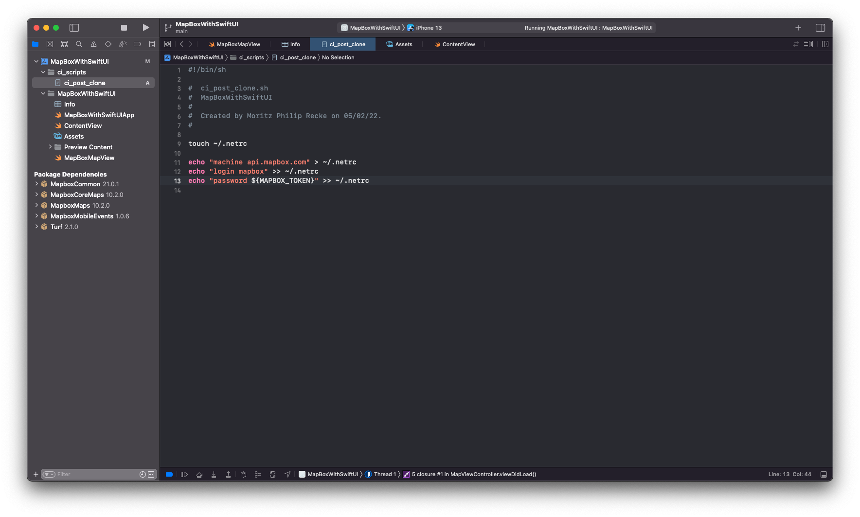 That's it. With the ci_post_clone.sh custom build script we are creating the needed .netrc file with the access credentials that the Mapbox SDK requires to resolve all dependencies after cloning the packages. To obscure the API access token from the file, we are using an environment variable to provide the token to the script when it is run.