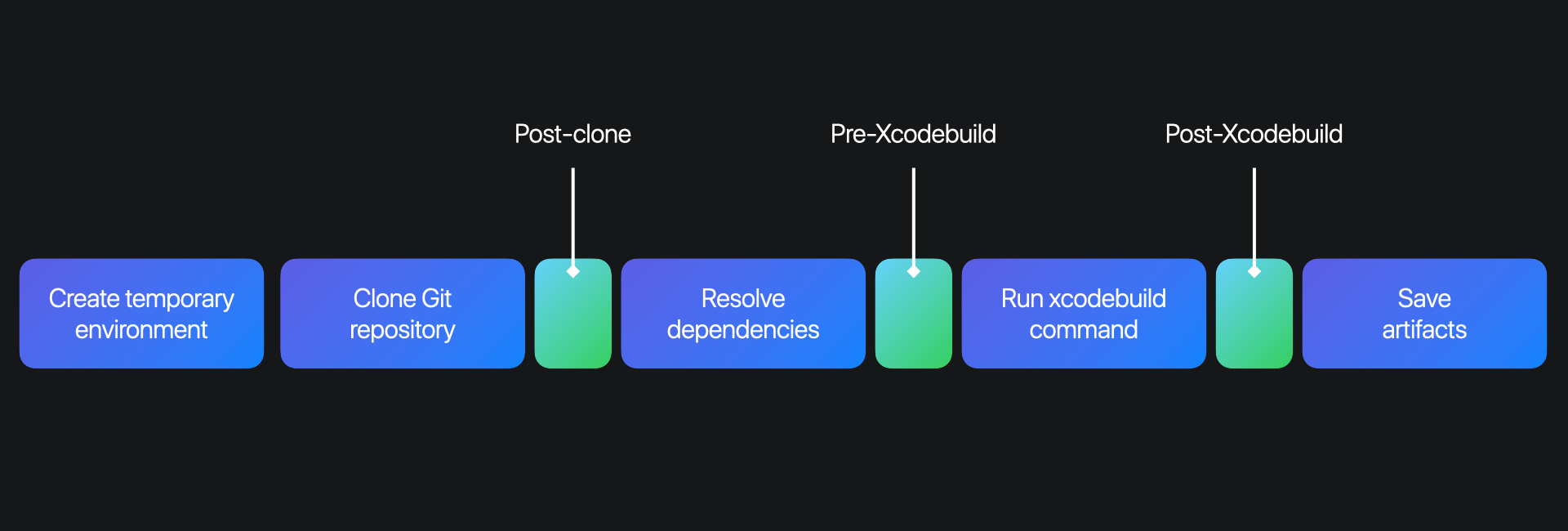 ci_post_clone.shas a file name. - Pre-Xcodebuild: It runs before the xcodebuild command is run in the Xcode Cloud environment and can be used to compile additional dependencies for example. It has to use