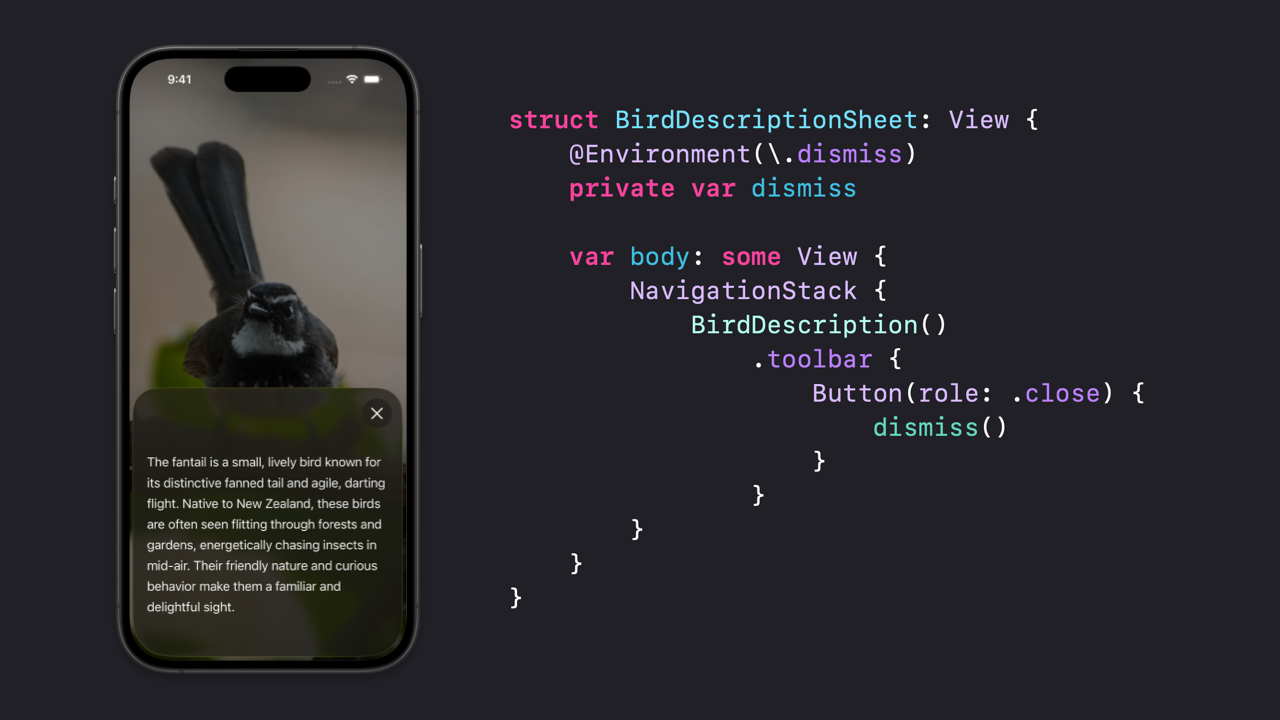 Natalia shares how to implement the close button in a modal simply by specifying the role in the Button view.
